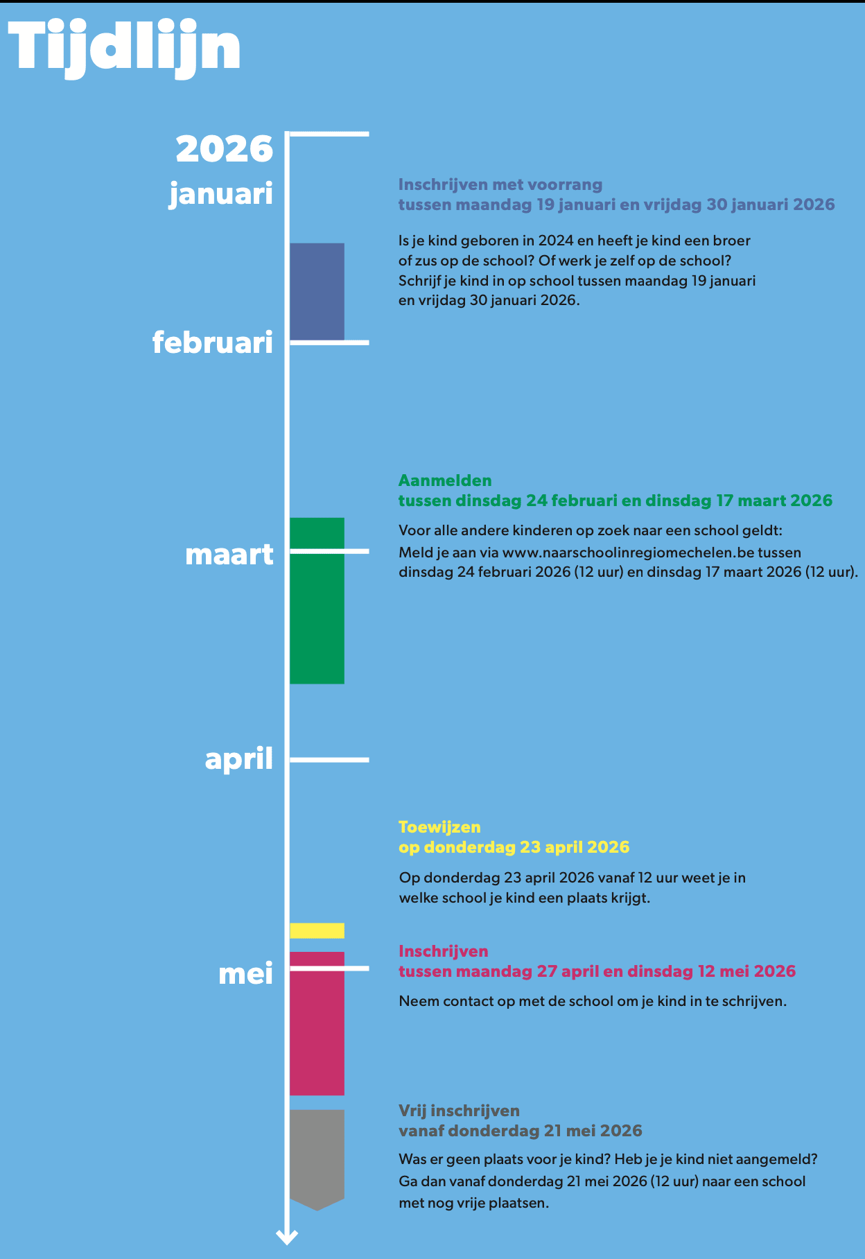 Voor de inschrijvingen van schooljaar 2026-2027 moet er aangemeld worden. Tussen 24 februari 2026 (12 uur) en 17 maart 2026 (12 uur) kan je uw kind aanmelden.  U kan extra info terugvinden op http://www.naarschoolinregiomechelen.be/ .